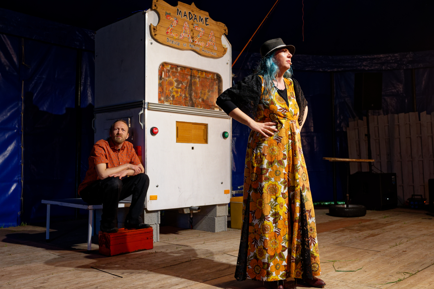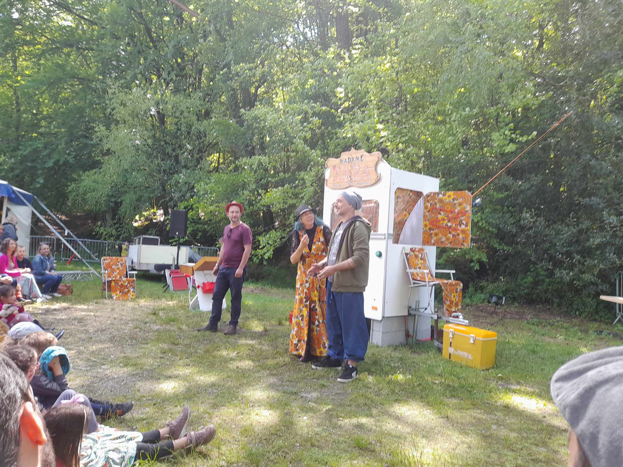 Devant sa petite caravane intrigante, à peine plus grande qu’une cabine de plage, elle installe son théâtre d’objets et convoque les destins, les rêves et les secrets, avec la complicité d’un public hilare et médusé.