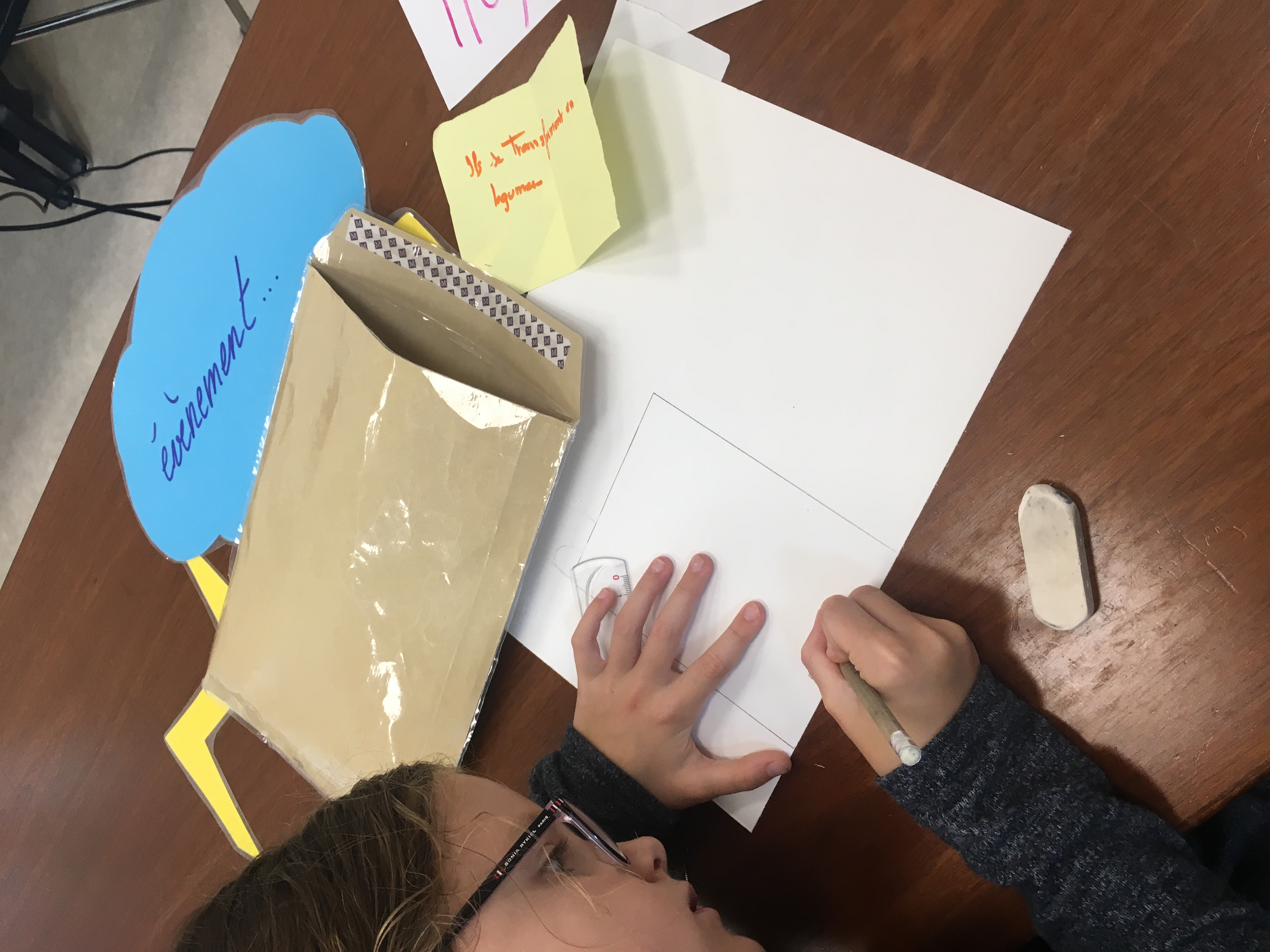 Cet atelier associe la création d’histoires et la création plastique. L’artiste utilise l’écriture en symboles, accessible à ceux qui ne savent pas lire et favorisant la mémorisation.
